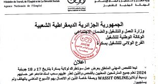 إعلان الوكالة الوطنية للتشغيل – الفرع الولائي للتشغيل بسكرة ads تبعا للفحص المهني المتعلق بعرض عمل سوناطراك لولاية بسكرة بتاريخ 17 و 18 جويلية 2024 نعلم جميع المترشحين المعنيين بالفحص والذين تعذر عليهم سحب استدعاءهم عبر حسابهم وسيط أونلاين WASSIT ONLINE وبصفة خاصة الذين …