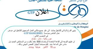 الجمهورية الجزائرية الديمقراطية الشعبية وزارة العمل التشغيل و الضمان الاجتماعي الوكالة الوطنية للتشغيل الفرع الولائي للتشغيل جانت ads إعلان GTP ينهي الفرع الولائي للتشغيل جانت إلى علم جميع طالبي العمل الموجهين للتشغيل في عرض عمل الخاص بمؤسسة GTP HASSI RMEL في المنصب التالي: عون …