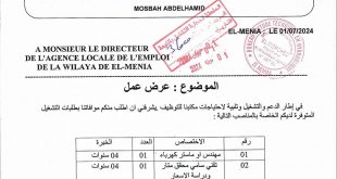 الجمهورية الجزائرية الديمقراطية الشعبية وزارة العمل والتشغيل والضمان الاجتماعي الوكالة الوطنية للتشغيل ads 2024-07-01 إيليزي في الفرع الولائي للتشغيل إيليزي توزيع عروض العمل على المكاتب البلدية للتشغيل لولاية إيليزي – رؤساء مكاتب التشغيل بلديات الولاية. عرض عمل المؤسسة الوارد إلى مصالحنا تحت رقم 24/24 …