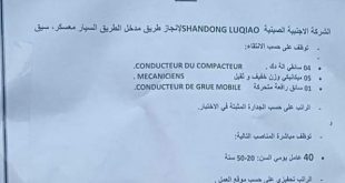 إعلان ads الشركة الأجنبية الصينية SHANDONG LUQIAO لإنجاز طريق مدخل الطريق السيار معسكر، سيق توظف على حسب الانتقاء: 04 سائقي آلة دك 05 ميكانيكي وزن خفيف و ثقيل 01 سائق رافعة متحركة الراتب على حسب الجدارة المثبتة في الاختبار توظف مباشرة المناصب التالية: 40 …