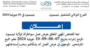 إعلان ads تبعا للفحص المهني المتعلق بعرض عمل سوناطراك لولاية تيميمون المزمع إجراءه بتاريخ 07-08-09-10 جويلية 2024 نعلم جميع المترشحين الموجهين في عرض العمل أنه بإمكانهم سحب إستدعائهم لإجتياز الفحص المهني عبر حسابهم وسيط أونلاين wassit online، و بالنسبة للمترشحين الموجهين بالعرض وليس لديهم …