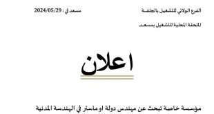 الجمهورية الجزائرية الديمقراطية الشعبية ads 2024/05/29 : مسعد في الفرع الولائي للتشغيل بالجلفة الملحقة المحلية للتشغيل بمسعد إعلان مؤسسة خاصة تبحث عن مهندس دولة أو ماستر في الهندسة المدنية الشروط: الإقامة ببلدية مسعد اللياقة البدنية يمتلك القدرة على المبادرة والعمل الجماعي لمن تتوفه فيه …