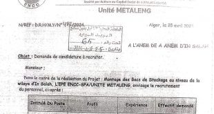 عرض عمل المؤسسة الوطنية للهياكل المعدنية والنحاسية ads الجهة المعنية: المؤسسة الوطنية للهياكل المعدنية والنحاسية (ENCC) : عين صالح، الجزائر المنصب: ingenieur en HSE عدد المناصب 01 الشروط: تلغرام مسابقات التوظيف مسابقات التوظيف أكتوبر 2025 مسابقات التوظيف 2025 اعلانات التوظيف حسب الولايات اعلانات التوظيف …