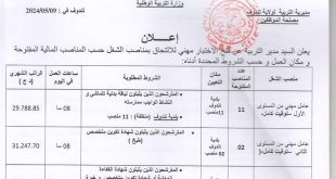 ads الجمهورية الجزائرية الديمقراطية الشعبية وزارة التربية الوطنية إعلان يعلن السيد مدير التربية عن فتح الاختبار مهني للالتحاق بمناصب الشغل حسب المناصب المالية المفتوحة و مكان العمل و حسب الشروط المحددة أدناه: المنصب عدد المناصب المفتوحةشروط المنصبمكان التعيينساعات العملالراتبعامل مهني من المستوى الأول توقيت …
