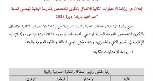 رزنامة الاختبارات الكتابية للالتحاق بالمدرسة الوطنية لمهندسي المدينة ads ملاحظة هامة: تجرى الاختبارات الكتابية على مستوى المدرسة الوطنية لمهندسي المدينة لرتبتي مفتش رئيسي للنظافة والنقاوة العمومية والبيئة،مهندس دولة للإدارة الإقليمية في التسيير التقني والحضري. تلغرام مسابقات التوظيف مسابقات التوظيف أكتوبر 2025 مسابقات التوظيف 2025 …