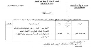 اعلان عن توظيف مديرية التربية لولاية تندوف ads تعلن مديرية التربية لولاية تندوف عن فتح مسابقة توظيف في الرتب المبينة ادناه عون ادارة رئيسي عدد المناصب 02 نمط التوظيف: على اساس الاختبارات ملف مسابقة على اساس الاختبار : طلب خطي يتم تظمين به ( …