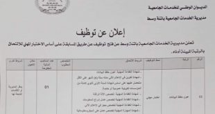 اعلان عن توظيف مديرية الخدمات الجامعية باتنة وسط ads تعلن مديرية الخدمات الجامعية باتنة وسط عن فتح مسابقة توظيف في الرتب المبينة ادناه عون حفظ البيانات عدد المناصب 01 نمط التوظيف: على اساس الاختبارات ملف مسابقة على اساس الاختبار : طلب خطي يتم تظمين …