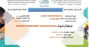 الفرع الولائي للتشغيل المسيلة الملحقة المحلية للتشغيل المسيلة عرض عمل شركة كوسيدار COSIDER CONSTRUCTION ads تعلن الملحقة المحلية للتشغيل المسيلة عن عرض عمل بشركة كوسيدار COSIDER CONSTRUCTION ما هو موضح ادناه الهيئة المستخدمة: شركة كوسيدار COSIDER CONSTRUCTION المناصب المطلوبة: موضحين في الصور المرفقة ادناه …
