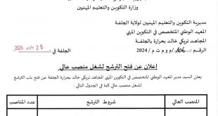 أكمل القراءة »اعلان عن فتح الترشح لشغل منصب عالي