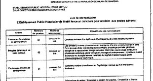 اعلان عن توظيف المؤسسة العمومية الاستشفائية بمتليلي ولاية غرداية ads تعلن المؤسسة العمومية الاستشفائية بمتليلي ولاية غرداية عن فتح مسابقة توظيف في الرتب المبينة ادناه صيدلي عام في الصحة العمومية عدد المناصب 01 منصب مط التوظيف: على اساس الشهادة بيولوجي من الدرجة الاولى في …