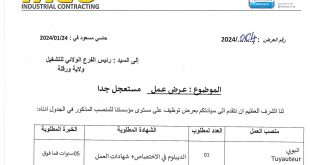 الفرع الولائي للتشغيل ورقلة عرض عمل شركة Industrial Construction ads يعلن الفرع الولائي للتشغيل ورقلة عن عرض عمل بشركة Industrial Construction كما هو موضح ادناه الهيئة المستخدمة : شركة Industrial Construction المناصب المطلوبة انبوبي عدد المناصب: 01 مكان العمل ورقلة طبيعة العقد / مجال …
