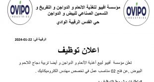 أكمل القراءة »اعلان عن توظيف بمؤسسة عويمر لتغذية الانعام والدواجن OVIPO