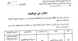 اعلان عن توظيف مديرية مسح الأراضي والحفظ العقاري لولاية توقرت ads يعلن مديرية مسح الأراضي والحفظ العقاري لولاية توقرت عن فتح مسابقة توظيف في الرتب المبينة ادناه مراقب مسح الاراضي عدد المناصب 01 منصب نمط التوظيف: على اساس الشهادة ملف المسابقة على أساس الشهادة …