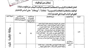 اعلان عن توظيف المكتبة الرئيسية للمطالعة العمومية لولاية البيض ads تعلن المكتبة الرئيسية للمطالعة العمومية لولاية البيض عن فتح مسابقة توظيف في الرتب المبينة ادناه كاتب عدد المناصب 01 منصب نمط التوظيف: على اساس الاختبار المهني عون حفظ البيانات عدد المناصب 02 منصب نمط …