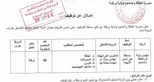 اعلان عن توظيف مديرية الطاقة والمناجم لولاية ورقلة ads تعلن مديرية الطاقة والمناجم لولاية ورقلة عن فتح مسابقة توظيف في الرتب المبينة ادناه مهندس دولة في الطاقة والمناجم عدد المناصب 02 منصب نمط التوظيف: مسابقة على اساس الشهادة ملف المسابقة على أساس الشهادة طلب …