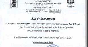 GROUPE GERHYD EPE SOGERHWIT SPA الشركة العامة للدراسات و انجازات الري سوجارويت اعلان عن توظيف ads هاتف: 043.22.82.46/043.22.82.56فاكس: 043.22.81.50الموقع الإلكتروني: www.sogerhwit.net البريد الإلكتروني: [email protected] تقوم شركة “EPE SOGERHWIT Spa” بتعيين (01) مدير أعمال أو مدير مشروعفي مجال تجميع معدات محطات معالجة مياه الصرف الصحيمع …
