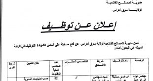 اعلان عن توظيف مديرية المصالح الفلاحية لولاية سوق اهراس ads تعلن مديرية المصالح الفلاحية لولاية سوق اهراس عن فتح مسابقة توظيف في الرتب المبينة ادناه مهندس دولة في الزراعة عدد المناصب 02 منصب نمط التوظيف: مسابقة على اساس الشهادة ملف المسابقة على أساس الشهادة …