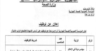 اعلان عن توظيف المؤسسة العمومية للصحة الجوارية ذراع بن خدة تيزي وزو ads تعلن المؤسسة العمومية للصحة الجوارية ذراع بن خدة تيزي وزو عن فتح مسابقة توظيف في الرتب المبينة ادناه مهندس دولة في الاعلام الالي عدد المناصب 01 منصب نمط التوظيف: مسابقة على …