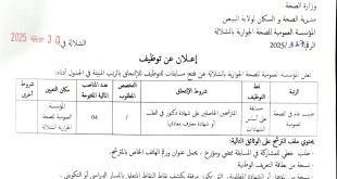 وزارة الصحة مديرية الصحة والسكان لولاية البيض المؤسسة العمومية للصحة الجوارية بالشلالة ads إعلان عن توظيف تعلن المؤسسة العمومية للصحة الجوارية بالشلالة عن فتح مسابقات للتوظيف بالإلتحاق بالرتب المبينة في الجدول أدناه: الرتبةالقطاعشروط المسابقةالتخصص المطلوبعدد المناصبنمط التعيينشروط أخرىطبيب عام في الصحة العموميةمسابقة على أساس …
