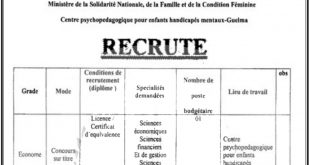اعلان عن توظيف المركز النفسي البيداغوجي للأطفال المعوقين ذهنيا قالمة ads يعلن المركز النفسي البيداغوجي للأطفال المعوقين ذهنيا قالمة عن فتح مسابقة توظيف في الرتب المبينة ادناه مقتصد عدد المناصب 01 منصب نمط التوظيف: مسابقة على اساس الشهادة ملف المسابقة على أساس الشهادة طلب …