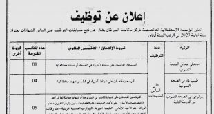 اعلان عن توظيف المؤسسة الاستشفائية المتخصصة مركز مكافحة السرطان بشار ads تعلن المؤسسة الاستشفائية المتخصصة مركز مكافحة السرطان بشار فتح مسابقة توظيف في الرتب المبينة ادناه صيدلي عام في الصحة العمومية عدد المناصب 01 منصب نمط التوظيف: مسابقة على اساس الشهادة طبيب عام في …