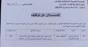 اعلان عن توظيف المؤسسة العمومية الاستشفائية الهادي بن جديد الطارف ads تعلن المؤسسة العمومية الاستشفائية الهادي بن جديد الطارف عن فتح مسابقة توظيف في الرتب المبينة ادناه مساعد تمريض للصحة العمومية عدد المناصب 05 منصب نمط التوظيف: توظيف مباشر تاريخ نشر الاعلان 23 نوفمبر …