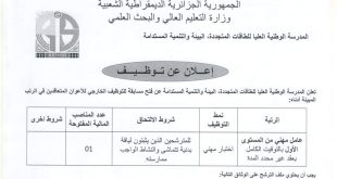 اعلان عن توظيف المدرسة الوطنية العليا للطاقات المتجددة البيئة والتنمية المستدامة باتنة ads تعلن المدرسة الوطنية العليا للطاقات المتجددة البيئة والتنمية المستدامة عن فتح مسابقة توظيف في الرتب المبينة ادناه عامل مهني من المستوى الاول عدد المناصب 01 منصب نمط التوظيف: مسابقة على اساس …