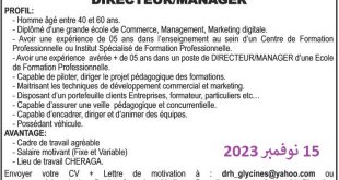مجمع تعليمي خاص مهم ads يبحث عن مدير مدير مدرسة التدريب المهني: رجل يتراوح عمره بين 40 و60 عامًا. خريج مدرسة كبرى للتجارة والإدارة والتسويق الرقمي. أن يكون لديك 05 سنوات من الخبرة في التدريس داخل مركز التكوين المهني أو معهد التكوين المهني المتخصص. …