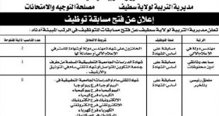 اعلان عن توظيف مديرية النربية لولاية سطيف ads تعلن مديرية النربية لولاية سطيف عن فتح مسابقة توظيف في الرتب المبينة ادناه مهندس دولة في الاعلام الالي عدد المناصب 02 منصب نمط التوظيف: مسابقة على اساس الشهادة مساعد وثائقي امين محفوظات عدد المناصب 01 نمط …