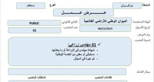 الفرع الولائي للتشغيـل مستغانم الملحقة المحلية للتشغيل مزغران عرض عمل الديوان الوطني للاراضي الفلاحية ads تعلن الملحقة المحلية للتشغيل مزغران عرض عمل بالديوان الوطني للاراضي الفلاحية كما هو موضح ادناه الهيئة المستخدمة الديوان الوطني للاراضي الفلاحية المناصب المطلوبة مهندس زراعي عدد المناصب 01 مكان …