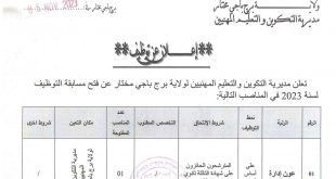اعلان عن توظيف مديرية التكوين والتعليم المهنيين لولاية برج باجي مختار ads تعلن مديرية التكوين والتعليم المهنيين لولاية برج بوعريريج عن فتح مسابقة توظيف في الرتب المبينة ادناه عون ادارة عدد المناصب 01 منصب نمط التوظيف: مسابقة على اساس الشهادة ملف المسابقة على أساس …