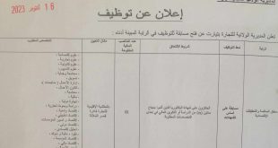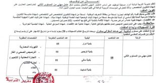 اعلان عن توظيف مديرية التربية لولاية ادرار ads تعلن مديرية التربية لولاية ادرار عن فتح مسابقة توظيف في الرتب المبينة ادناه ملحق بالمخبر عدد المناصب 08 منصب نمط التوظيف: مسابقة على اساس الشهادة عامل مهني من المستوى الاول – توقيت كامل عدد المناصب 18 …