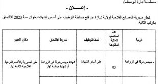 اعلان عن توظيف مديرية المصالح الفلاحية لولاية البيض ads تعلن مديرية المصالح الفلاحية لولاية البيض عن فتح مسابقة توظيف على اساس الشهادة في الرتب المبينة ادناه مهندس دولة في الزراعة عدد المناصب 02 منصب نمط التوظيف: مسابقة على اساس الشهادة ملف المسابقة على أساس …