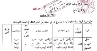 اعلان توظيف مديرية الثقافة لولاية عين قزام ads يعلن مدير الثقافة لولاية عين قزام عن فتح مسابقة توظيف على اساس الشهادة وعلى اساس الانتقاء في الرتب المبينة ادناه محاسب اداري عدد المناصب 01 منصب نمط التوظيف: مسابقة على اساس الشهادة كاتب عدد المناصب 01 …