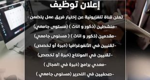 إعلان توظيف ads تعلن قناة تلفزيونية عن إختيار فريق عمل يتضمن : -منشطين (ذكور و اناث ) (مستوى جامعي) -مقدمين (ذكور و اناث ) ( مستوى جامعي) -تقنيين في الأنفوغرافيا (خبرة أو تخصص) -تقنيين في المونتاج (خبرة أو تخصص) -معدي برامج (خبرة في المجال …