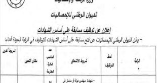 اعلان توظيف الديوان الوطني للاحصائيات ads تعلن الديوان الوطني للاحصائيات عن فتح مسابقة توظيف على اساس الشهادة في الرتب المبينة ادناه مهندس دولة في الاحصائيات عدد المناصب 16 منصب نمط التوظيف على اساس الشهادة ملف المسابقة على أساس الشهادة طلب خطي يتم تضمين به …