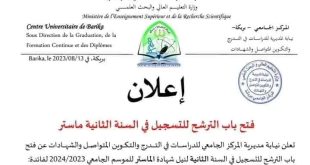 بريكة، في 2023/08/13 Barika, le المركز الجامعي بريكة الجمهورية الجزائرية الديمقراطيـة الشعيـة فتح باب الترشح للتسجيل في السنة الثانية ماستر ads تعلن نيابة مديرية المركز الجامعي للدراسات في التـدرج والتكوين المتواصل والشهادات عن فتح باب الترشح للتسجيل في السنة الثانية لنيل شهادة الماستر للموسم …