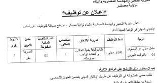 وزارة السكن والعمران والمدينة مديرية التعمير والهندسة المعمارية والبناء لولاية معسكر ads إعلان عن توظيف تعلن مديرية التعمير والهندسة المعمارية والبناء لولاية معسكر، عن فتح مسابقة للتوظيف على أساس الإختيار المهني في الرتبة المبينة أدناه: الرتبةنمط التوظيفشروط الإلتحاقالتخصص المطلوبعدد المناصب المفتوحةمكان التعيينشروط أخرى01 – …
