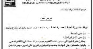 إعلان عن توظيف التعاضدية العامة لمواد البناء ads تعلن المديرية العامة للتعاضدية العامة لمواد البناء الكائن مقرها ب شارع الإخوة مروان (برليوز سابقا)، الجزائر الوسطى، الجزائر العاصمة عن توظيف في الرتب التالية: ✓ مدير الصحة : 01 ✓ مدير الإدارة و المالية : 01 …