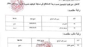 مديرية التربية لولاية برج باجي مختار قائمة الناجحين ads قائمة الناجحين في مسابقة التوظيف بمديرية التربية لولاية برج باجي مختار قــــائمة الناجحين نهائيا في المسابقة على أساس الشهادة حسب درجة الاستحقاق للإلتحاق في الرتب التالية: مشرف التربية مقتصد نائب مقتصد مستشار التوجيه والارشاد المهني …