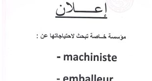 الملحقة المحلية للتشغيل بعين وسارة الجلفة عرض عمل مؤسسة خاصة ads تعلن الملحقة المحلية للتشغيل بعين وسارة عن عرض عمل بمؤسسة خاصة كما هو موضح ادناه الهيئة المستخدمة مؤسسة خاصة المناصب المطلوبة machiniste عدد المناصب: 01 emballeur عدد المناصب: 01 طبيعة العقد : / …