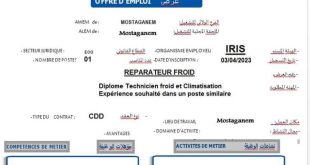 الملحقة المحلية للتشغيل مستغانم عرض عمل شركة IRIS ads تعلن الملحقة المحلية للتشغيل مستغانم عن عرض عمل بشركة IRIS كما هو موضح ادناه الهيئة المستخدمة شركة IRIS المناصب المطلوبة REPARATEUR FROID عدد المناصب: 01 طبيعة العقد : CDD مجال النشاط : / مكان العمل …