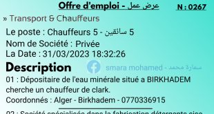 عروض عمل الولايات المعنية الجزائر العاصمة، باتنة، خنشلة يرجى من المهتمين التقرب من الملحقة المحلية للتشغيل المعنية بالعرض ads عرض عمل في منصب : 5 سائقين5 Chauffeurs الملحقة المحلية للتشغيل باتنة عرض عمل المناصب المطلوبة الملحقة المحلية للتشغيل خنشلة عرض عمل مؤسسة SERO EST …