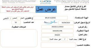 الملحقة المحلية للتشغيل سيق معسكر عرض عمل مؤسسة BRUM ALGERIE ads تعلن الملحقة المحلية للتشغيل سيق معسكر عن عرض عمل بمؤسسة BRUM ALGERIE كما هو موضح ادناه الهيئة المستخدمة مؤسسة BRUM ALGERIE المناصب المطلوبة MANOEUVRE عدد المناصب: 03 طبيعة العقد : cdd مجال النشاط …