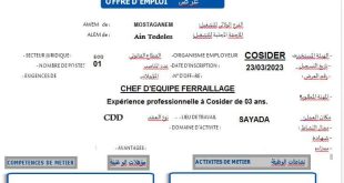 الملحقة المحلية للتشغيل مستغانم عرض عمل شركة كوسيدار COSIDER ads تعلن الملحقة المحلية للتشغيل مستغانم عن عرض عمل بشركة كوسيدار COSIDER كما هو موضح ادناه الهيئة المستخدمة شركة كوسيدار COSIDER المناصب المطلوبة chef d’équipe ferraillage عدد المناصب: 01 طبيعة العقد : / مجال النشاط …