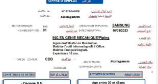 الملحقة المحلية للتشغيل مستغانم عرض عمل شركة سامسونج SAMSUNG الجزائر ads تعلن الملحقة المحلية للتشغيل مستغانم عن عرض عمل بشركة سامسونج SAMSUNG الجزائر كما هو موضح ادناه الهيئة المستخدمة شركة سامسونج SAMSUNG الجزائر المناصب المطلوبة مهندس في الهندسة الميكانكية عدد المناصب: 01 طبيعة العقد …