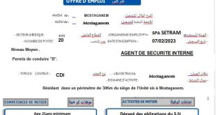 أكمل القراءة »عرض عمل اعوان امن بشركة SPA SETRAM