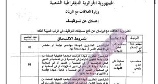 اعلان عن توظيف وزارة العلاقات مع البرلمان ads تعلن وزارة العلاقات مع البرلمان عن فتح مسابقة توظيف على اساس الشهادة في الرتب المبينة ادناه مهندس دولة في الاعلام الالي عدد المناصب 01 منصب نمط التوظيف مسابقة على اساس الشهادة محاسب اداري رئيسي عدد المناصب …