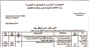اعلان عن توظيف مديرية الاشغال العمومية لولاية المنيعة ads تعلن مديرية الاشغال العمومية لولاية المنيعة عن فتح مسابقة توظيف على اساس الشهادة في الرتب المبينة ادناه مهندس دولة في الاشغال العمومية عدد المناصب 09 منصب نمط التوظيف مسابقة على اساس الشهادة مهندس دولة في …