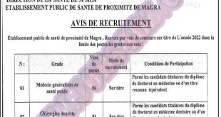 اعلان عن توظيف المؤسسة العمومية للصحة العمومية مقرة المسيلة ads تعلن المؤسسة العمومية للصحة العمومية مقرة المسيلة عن فتح مسابقة توظيف على اساس الشهادة في الرتب المبينة ادناه طبيب عام في الصحة العمومية عدد المناصب 06 نمط التوظيف مسابقة على اساس الشهادة جراح اسنان …